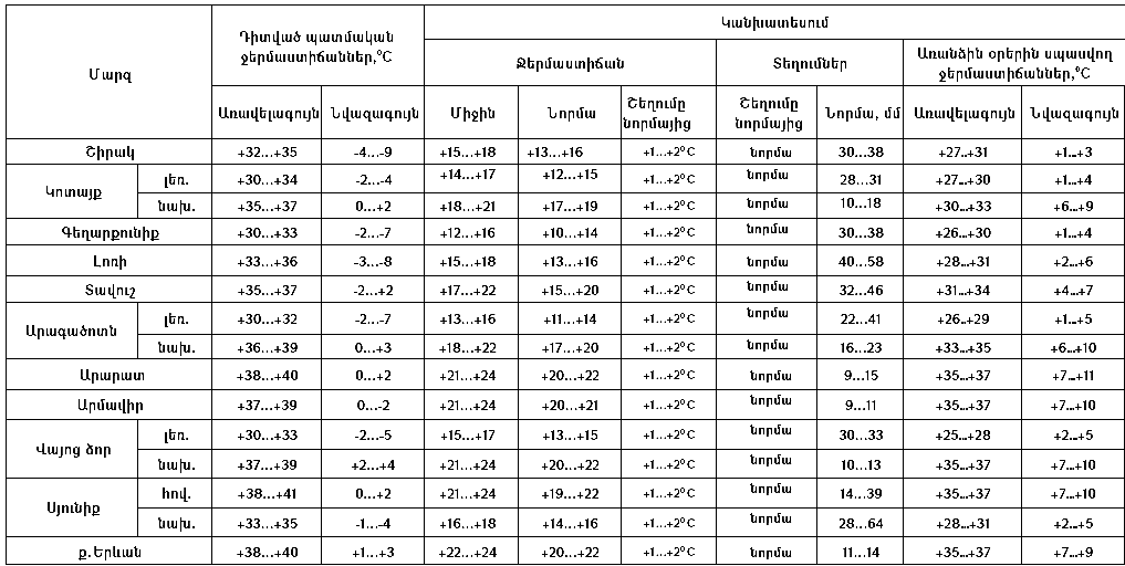 Օդի ամսական միջին ջերմաստիճանը հանրապետության ողջ տարածքում կանխատեսվում է նորմայից բարձր 1-2 աստիճանով, տեղումների քանակը՝ նորմային մոտ։