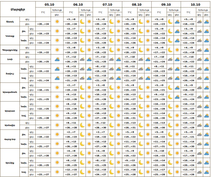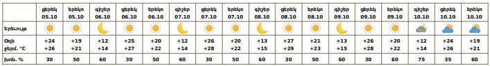 Հոկտեմբերի 5-ի ցերեկը, 6-10-ին սպասվում է առանց տեղումների եղանակ։ Քամին՝ արևմտյան՝ 2-5մ/վ։ Օդի ջերմաստիճանը հոկտեմբերի 5-ի ցերեկը, 6-8-ին աստիճանաբար կբարձրանա ևս 2-3 աստիճանով: