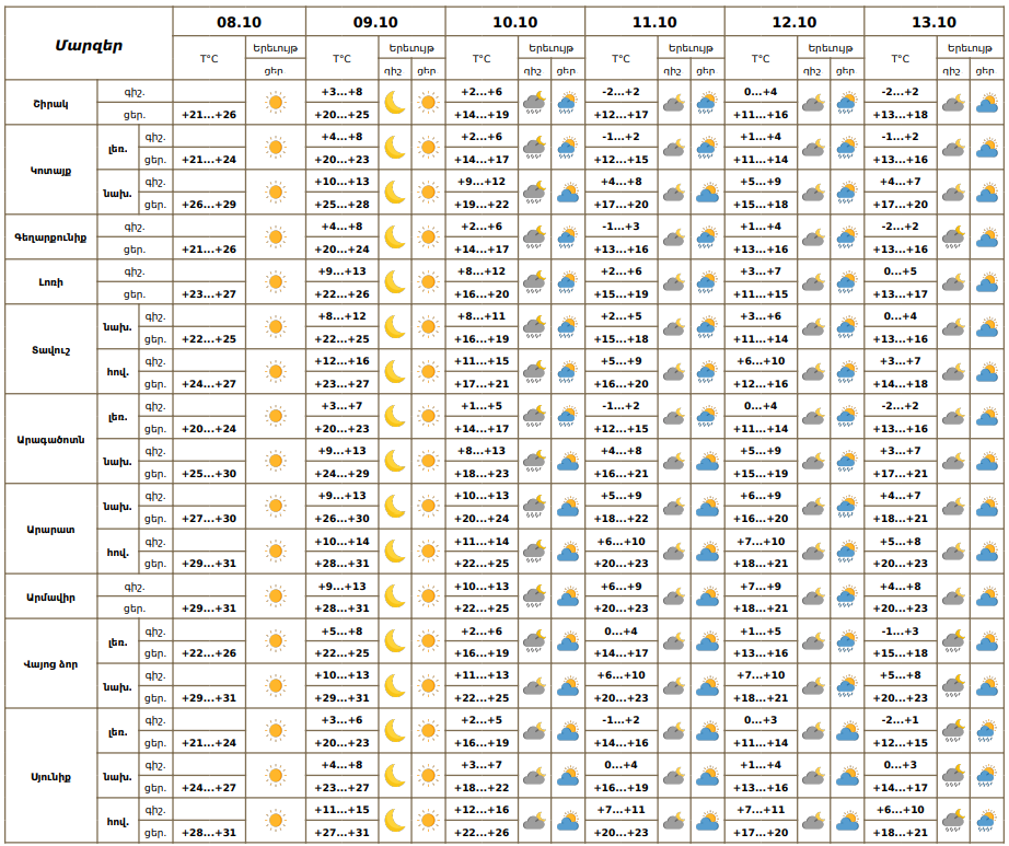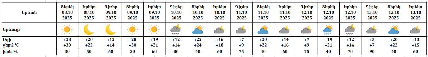 Հոկտեմբերի 8-ի ցերեկը, 9-ին, 11-12-ի գիշերը սպասվում է առանց տեղումների եղանակ։ Հոկտեմբերի 10-ի և 13-ի գիշերը և առավոտյան, 11-12-ի ցերեկը առանձին շրջաններում սպասվում է կարճատև անձրև։ Քամին՝ հարավարևմտյան՝ 2-5մ/վ, հոկտեմբերի 8-ի ցերեկը, 9-12-ին առանձին շրջաններում սպասվում է քամու ուժգնացում ՝ 15-18 մ/վ արագությամբ։ Օդի ջերմաստիճանը հոկտեմբերի 10-12-ին աստիճանաբար կնվազի 5-9 աստիճանով: