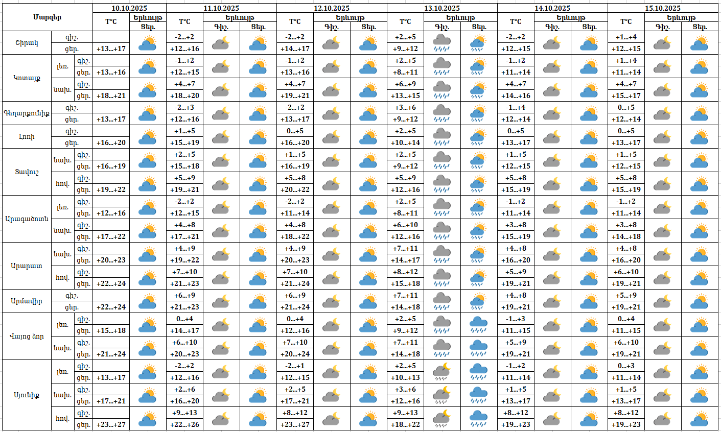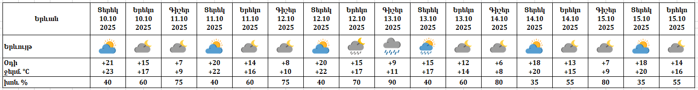 Հոկտեմբերի 10-ի ցերեկը, 11-ին, 13-14-ին սպասվում է առանց տեղումների եղանակ։ Հոկտեմբերի 12-ի երեկոյան ժամերին և 13-ին սպասվում է անձրև։