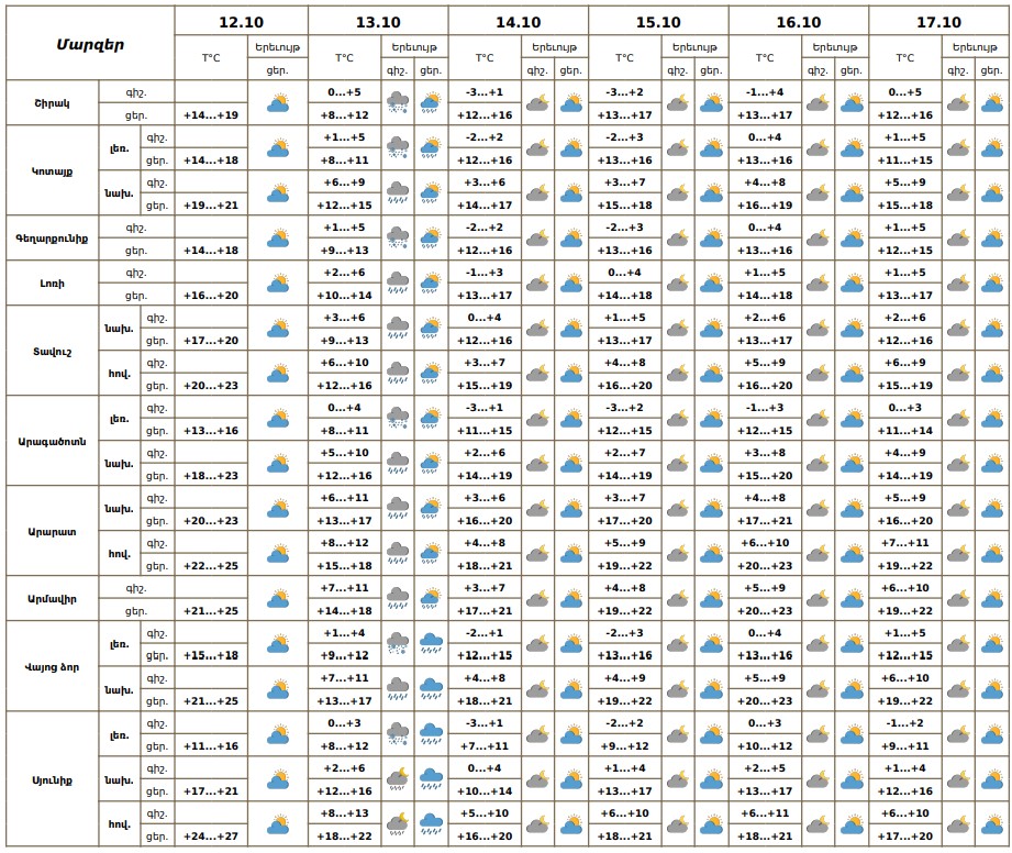 Հոկտեմբերի 12-ի ուշ երեկոյան առանձին շրջաններում, 13-ին շրջանների մեծ մասում սպասվում են տեղումներ, լեռնային առանձին շրջաններում ձնախառն անձրևի տեսքով։ Հոկտեմբերի 14-17-ին սպասվում է առանց տեղումների եղանակ։ Քամին՝ հյուսիսարևմտյան՝ 2-5մ/վ, հոկտեմբերի 13-ին առանձին շրջաններում սպասվում է քամու ուժգնացում՝ 17-20 մ/վ արագությամբ։ Օդի ջերմաստիճանը հոկտեմբերի 13-ի ցերեկը կնվազի՝ 5-7 աստիճանով, այնուհետև նույնքան կբարձրանա։
