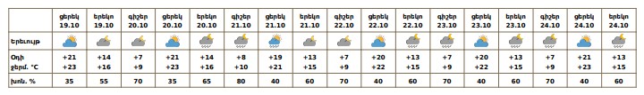 Հոկտեմբերի 19-ի ցերեկը, 20-ի գիշերը սպասվում է առանց տեղումների եղանակ։ Հոկտեմբերի 20-ին կեսօրից հետո, 21-24-ին առանձին շրջաններում սպասվում է կարճատև անձրև։ Քամին արևմտյան՝ 2-5մ/վ, հոկտեմբերի 21-ին առանձին շրջաններում հնարավոր է քամու ուժգնացում՝ 16-19 մ/վ արագությամբ։ Օդի ջերմաստիճանը հոկտեմբերի 20-21-ին գիշերը կբարձրանա 4-5 աստիճանով։