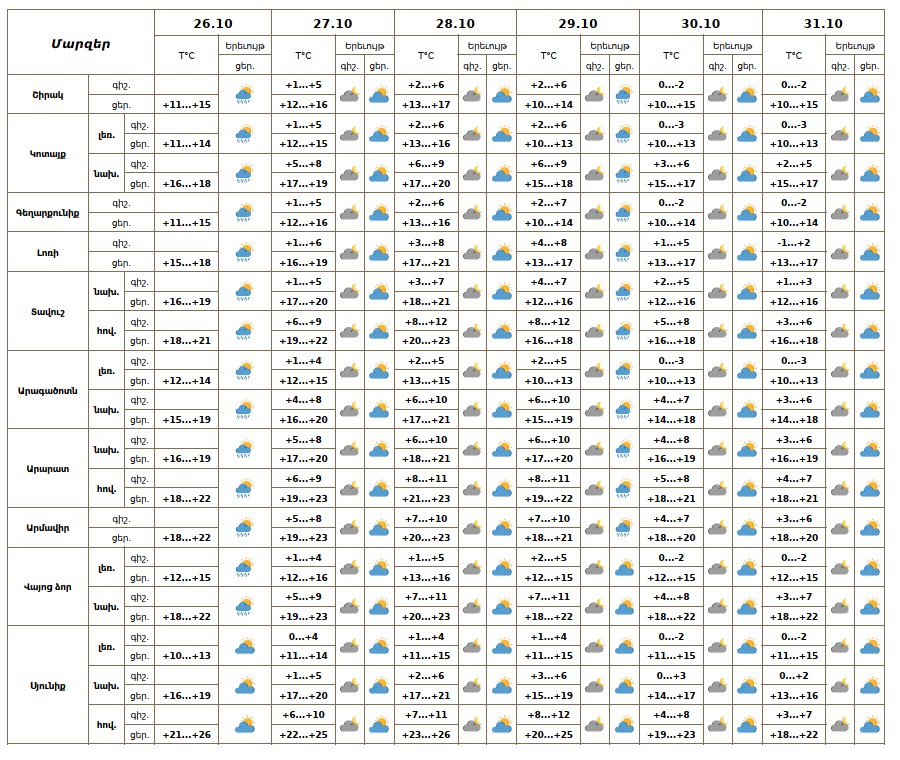 2-5մ/վ: Օդի ջերմաստիճանը հոկտեմբերի 26-ի ցերեկը կնվազի 2-3 աստիճանով, 27-28-ին աստիճանաբար նույնքան կբարձրանա։