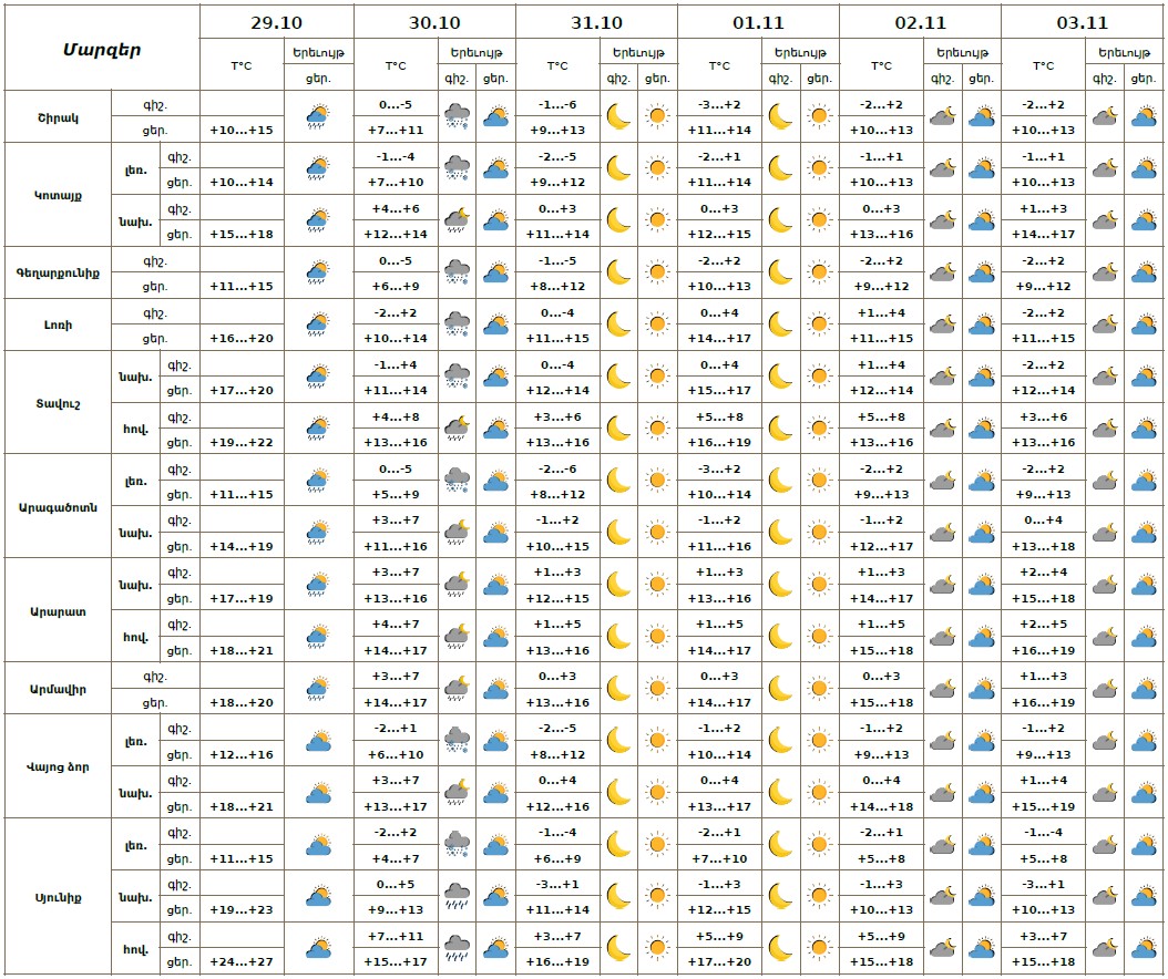 Հոկտեմբերի 29-ի ցերեկն առանձին շրջաններում, 30-ի գիշերը՝ շրջանների զգալի մասում սպասվում են տեղումներ` լեռնային շրջաններում թաց ձյան, հովտային շրջաններում՝ անձրևի տեսքով։ Առանձին վայրերում տեղումները կլինեն հորդառատ: Հոկտեմբերի 30-ի ցերեկը, 31-ին, նոյեմբերի 1-3-ին սպասվում է առանց տեղումների եղանակ: