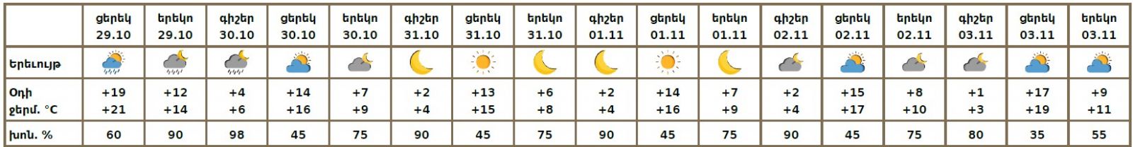 Հոկտեմբերի 29-ի ցերեկը, 30-ի գիշերը սպասվում է անձրև։ Հոկտեմբերի 30-ի ցերեկը, 31-ին, նոյեմբերի 1-3-ին սպասվում է առանց տեղումների եղանակ։