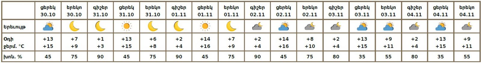 Հոկտեմբերի 30-ի ցերեկը, 31-ին, նոյեմբերի 1-4-ին սպասվում է առանց տեղումների եղանակ: Քամին հյուսիսարևմտյան՝ 2-5մ/վ: