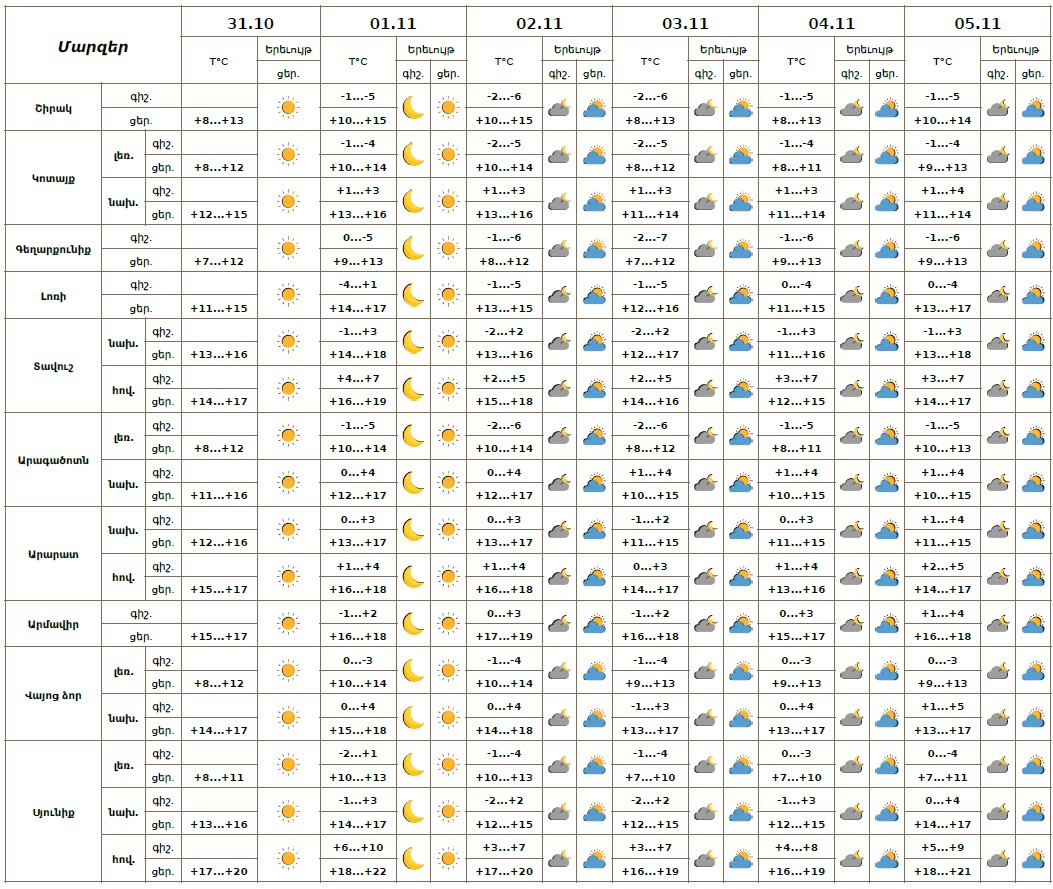 Հոկտեմբերի 31-ի ցերեկը, նոյեմբերի 1-5-ին սպասվում է առանց տեղումների եղանակ: