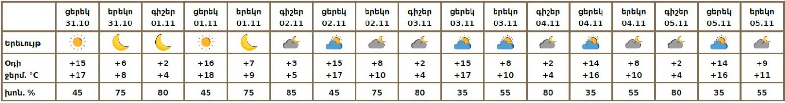 Քամին հարավարևմտյան՝ 2-5մ/վ: Օդի ջերմաստիճանը նոյեմբերի 1-2-ին աստիճանաբար կբարձրանա 2-3 աստիճանով։