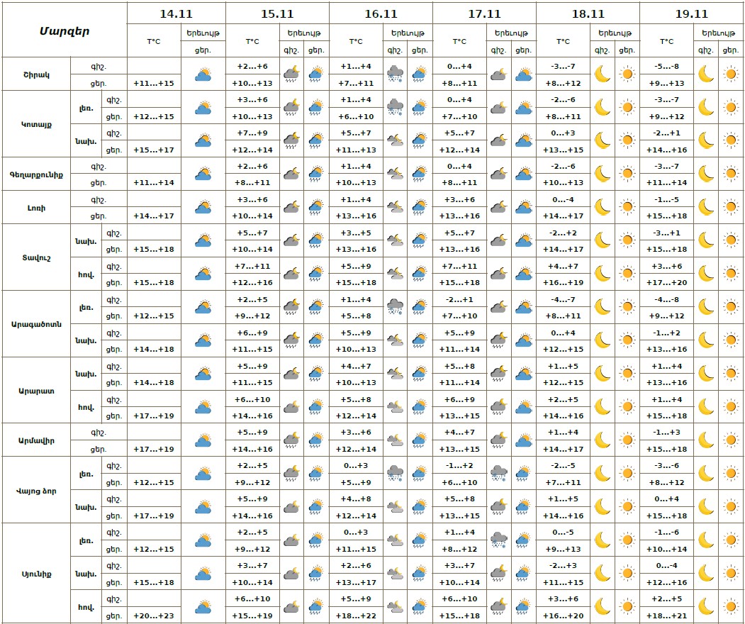 Նոյեմբերի 14-ի ցերեկը, 18-19-ին սպասվում է առանց տեղումների եղանակ։ Նոյեմբերի 15-16-ին, 17-ի գիշերը և առավոտյան սպասվում է կարճատև անձրև։