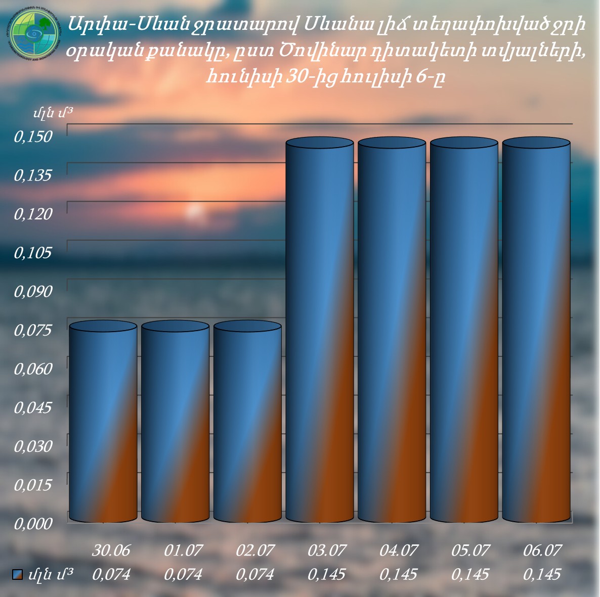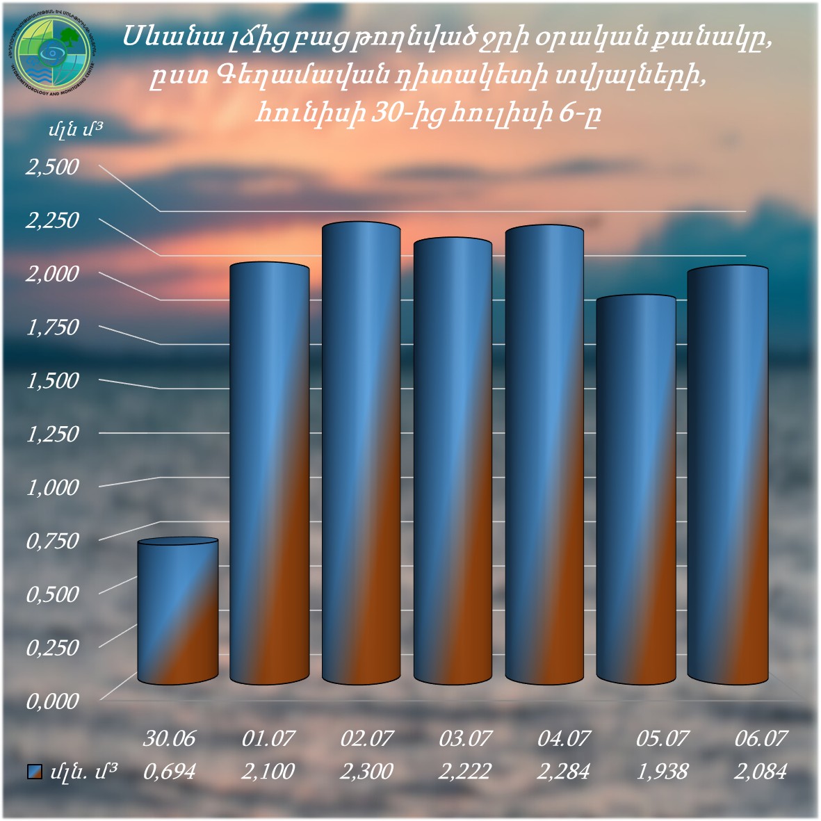 Սևանա լճից բացթողնված ջրի ծավալը ըստ Հրազդան ՀԷԿ-ի ուղղաթեք ջրանցքի Գեղամավան դիտակետի հունիսի 30-ից հուլիսի 6-ը ներառյալ ընկած ժամանակահատվածում կազմել է 13.622 մլն.մ3, իսկ ընդհանուր գումարային բացթողումը՝ հունիսի 6-ից հուլիսի 6-ը ներառյալ՝ 52.892 մլն.մ3: