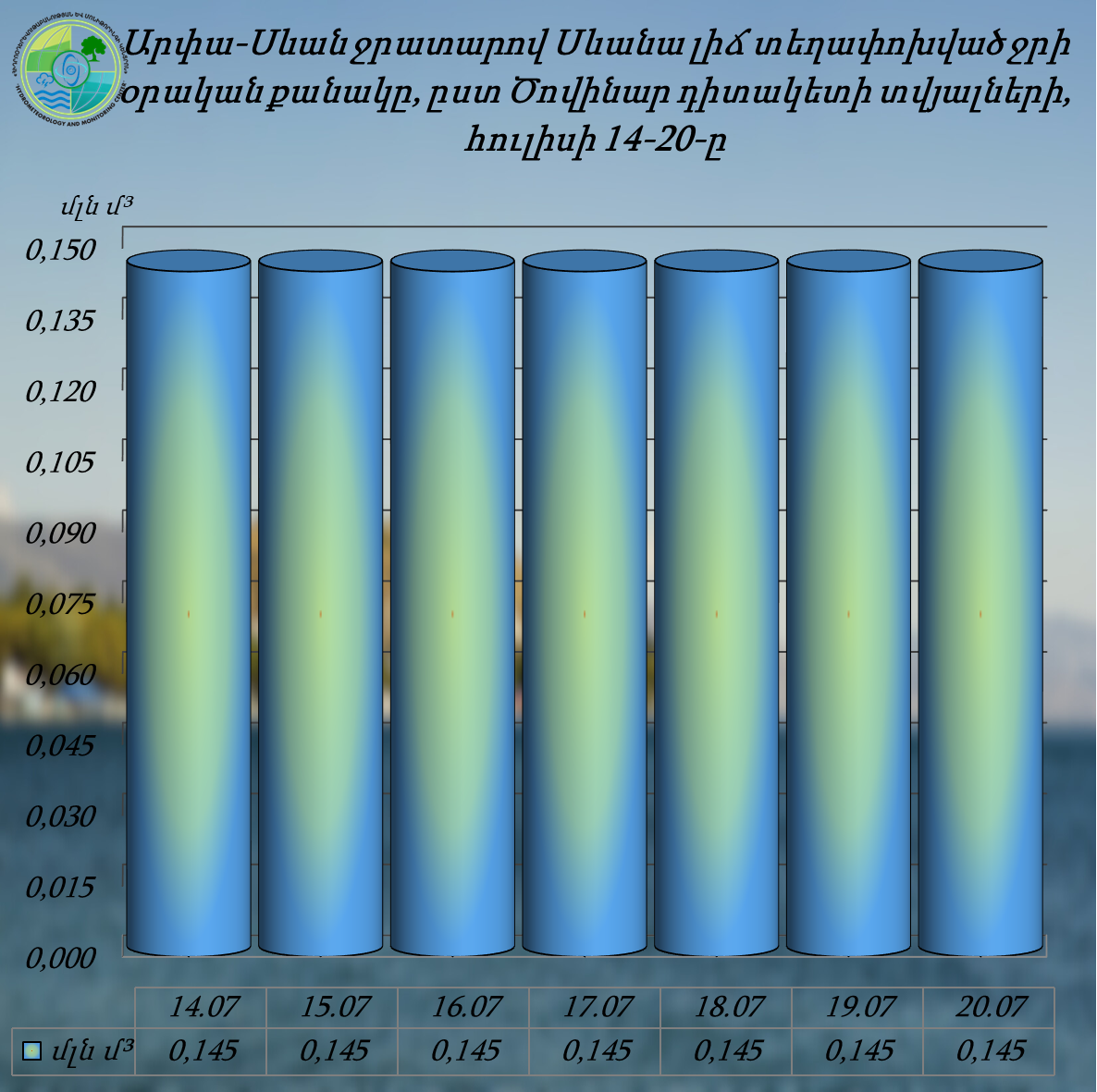 Սևանա լճից բացթողնված ջրի ծավալը ըստ Հրազդան ՀԷԿ-ի ուղղաթեք ջրանցքի Գեղամավան դիտակետի հուլիսի 14-20-ը ներառյալ ընկած ժամանակահատվածում կազմել է 15.294 մլն.մ3, իսկ ընդհանուր գումարային բացթողումը՝ հունիսի 6-ից հուլիսի 20-ը ներառյալ՝ 81.245 մլն.մ3: