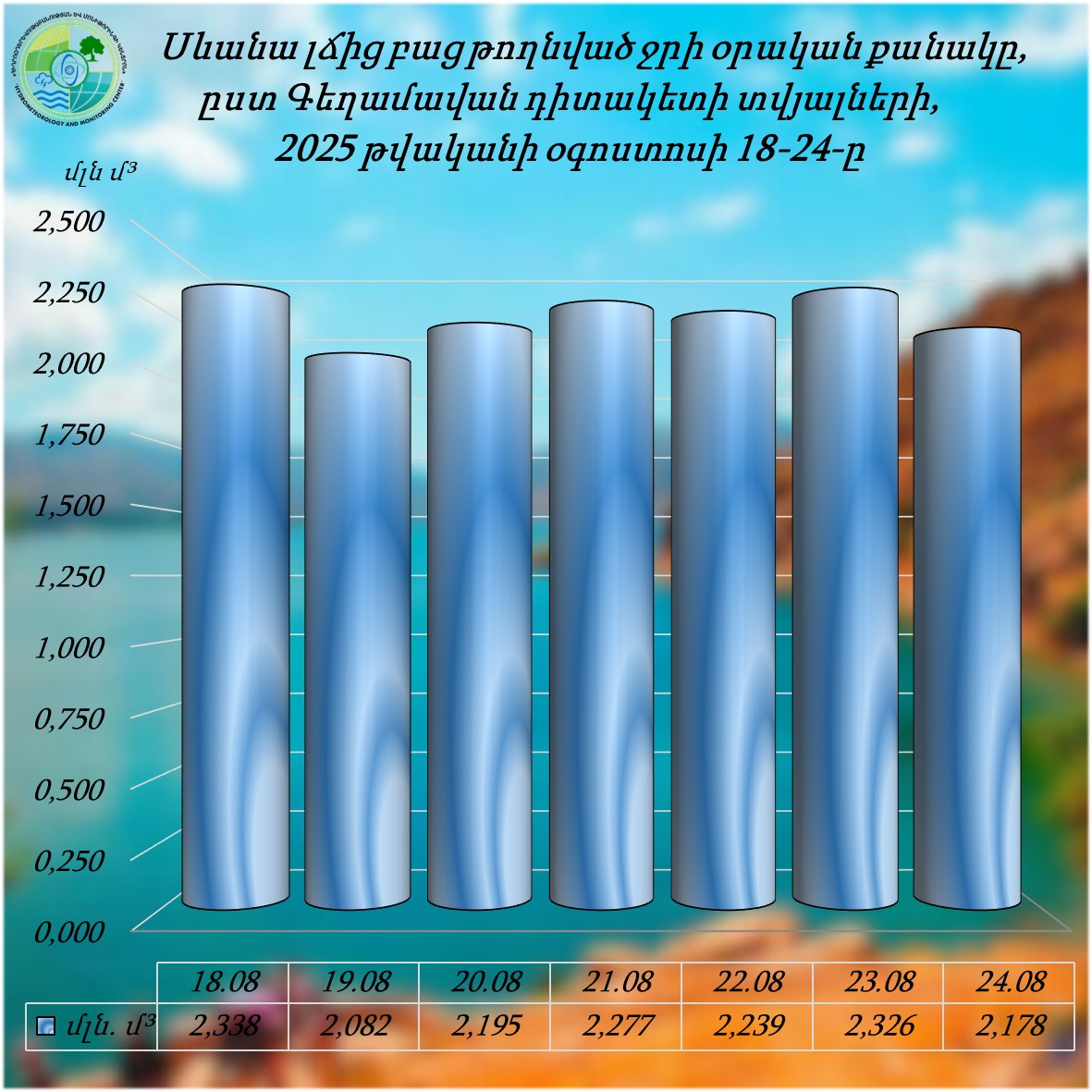 Սևանա լճից բացթողնված ջրի ծավալը ըստ Հրազդան ՀԷԿ-ի ուղղաթեք ջրանցքի Գեղամավան դիտակետի օգոստոսի 18-24-ը ներառյալ ընկած ժամանակահատվածում կազմել է 15.635 մլն.մ3, իսկ ընդհանուր գումարային բացթողումը՝ հունիսի 6-ից օգոստոսի 24-ը ներառյալ՝ 147.813 մլն.մ3: