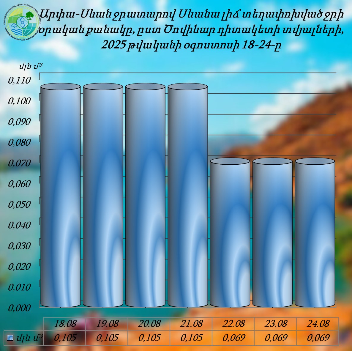 Արփա-Սևան ջրատարով 2025 թվականի օգոստոսի 18-24-ն ընկած ժամանակահատվածում Սևանա լիճ տեղափոխված ջրի քանակը կազմել է 0.627 մլն.մ3, իսկ 2025 թվականի հունվարի 1-ից օգոստոսի 24-ը ներառյալ՝ 100.734 մլն.մ3: