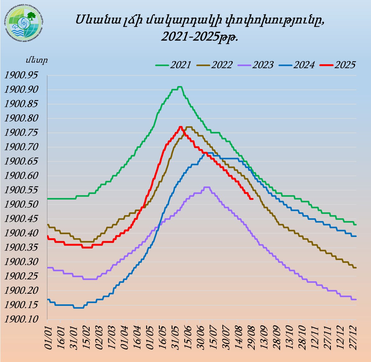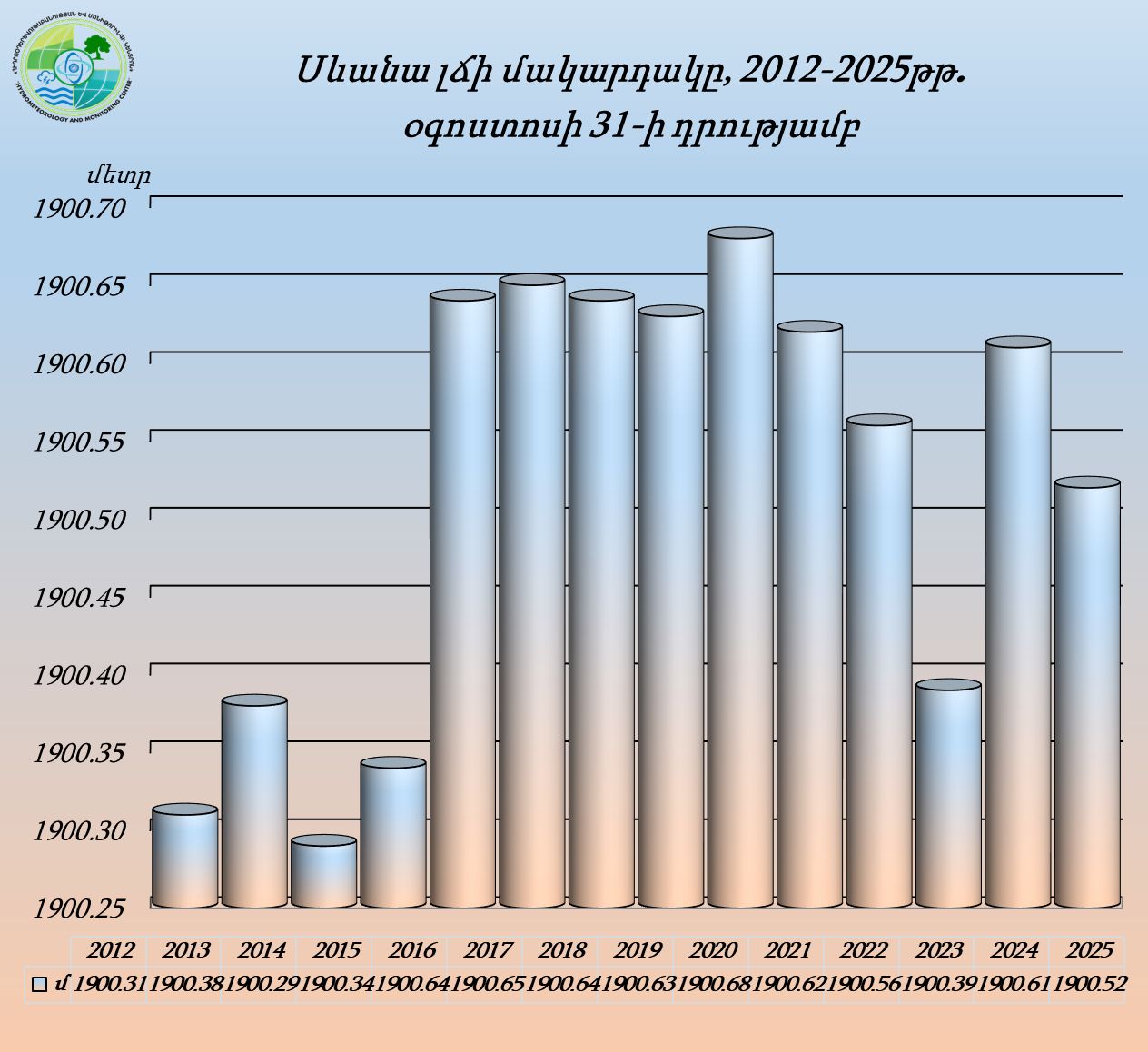 Սևանա լճի մակարդակը 2025 թվականի օգոստոսի 25-31-ն ընկած ժամանակահատվածում իջել է 2 սմ-ով և կազմել՝ 1900.52 մ (31.08.25թ․), որն անցյալ տարվա նույն օրվա մակարդակից ցածր է 9 սմ-ով, իսկ 2025 թվականի հունվարի 1-ի մակարդակից բարձր է 13 սմ-ով։