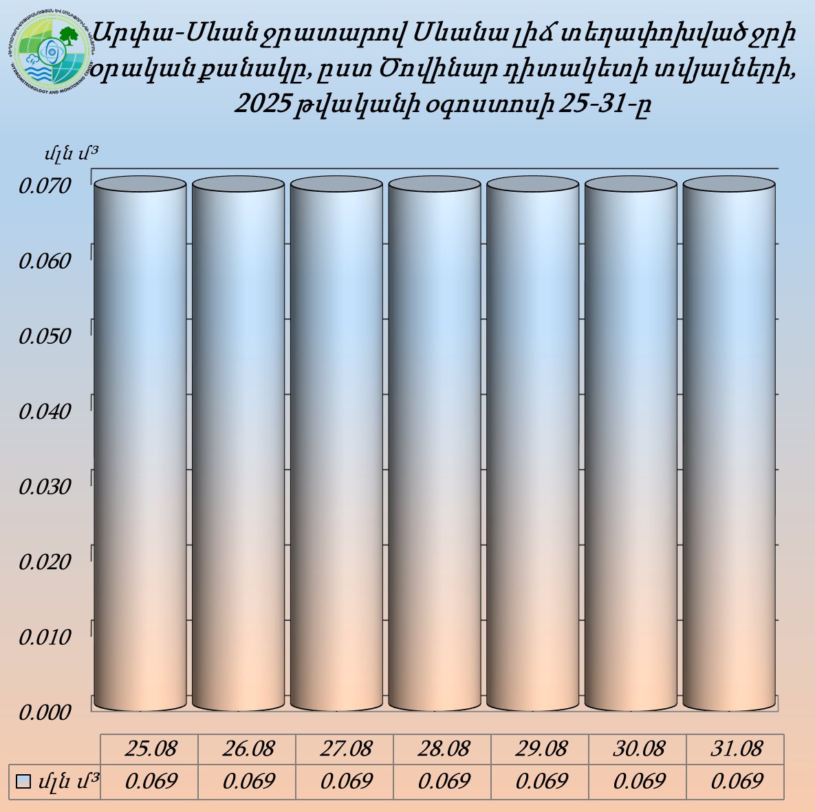 Սևանա լճից բացթողնված ջրի ծավալը ըստ Հրազդան ՀԷԿ-ի ուղղաթեք ջրանցքի Գեղամավան դիտակետի օգոստոսի 25-31-ը ներառյալ ընկած ժամանակահատվածում կազմել է 9.271 մլն.մ3, իսկ ընդհանուր գումարային բացթողումը՝ հունիսի 6-ից օգոստոսի 31-ը ներառյալ՝ 157.084 մլն.մ3: